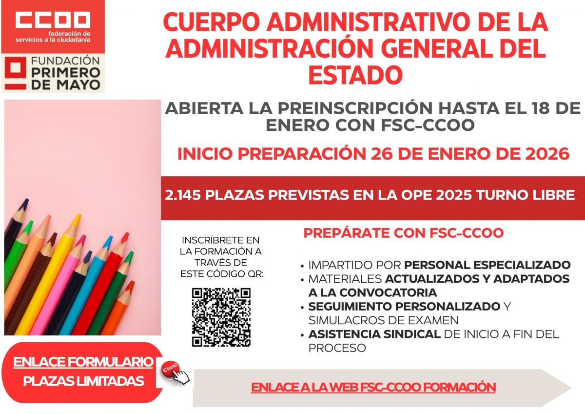 La Federación de Servicios a la Ciudadanía de CCOO, en colaboración con la Fundación 1º de mayo, pone en marcha una nueva convocatoria de su curso de preparación online para las oposiciones de los Cuerpos del Estado, en la categoría de Administrativo en turno libre.