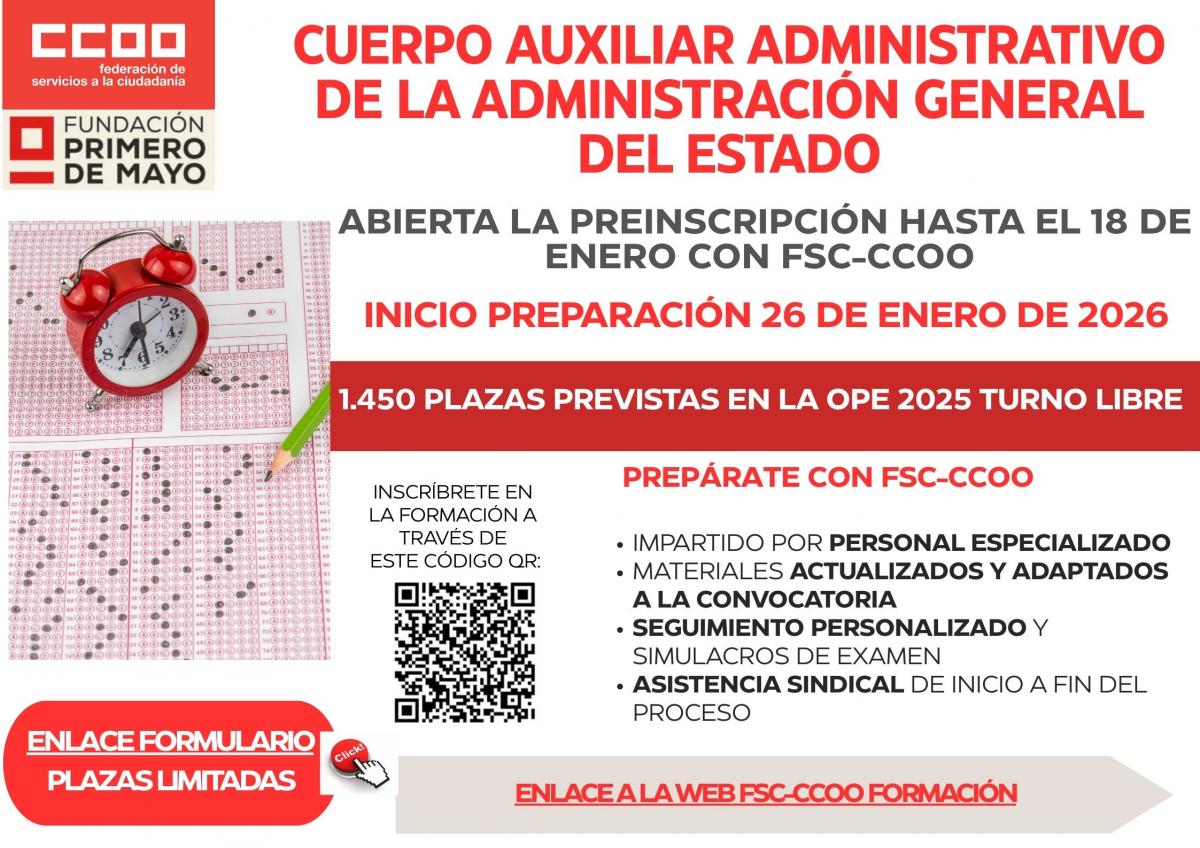 La Federación de Servicios a la Ciudadanía de CCOO, en colaboración con la Fundación 1º de mayo, pone en marcha una nueva convocatoria de su curso de preparación online para las oposiciones de los Cuerpos del Estado, en la categoría de Auxiliar Administrativo en turno libre.